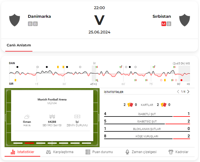 EURO 2024 C Grubu’nun son maçları kapsamında Münih’te Danimarka ile Sırbistan, 0-0 berabere kaldı ve bu sonuçla Danimarka ikinci olarak üst tura yükselirken Sırbistan ise turnuvaya veda etti.