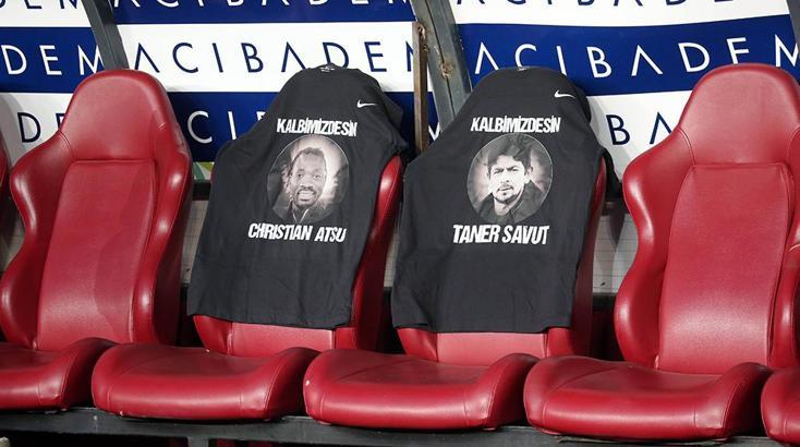 Mücadele öncesi 6 Şubat’taki depremde hayatını kaybeden Hatayspor futbolcusu Christian Atsu ve Sportif Direktör Taner Savut’un resimlerinin bulunduğu tişörtler, konuk ekibin yedek kulübesinde yer aldı.