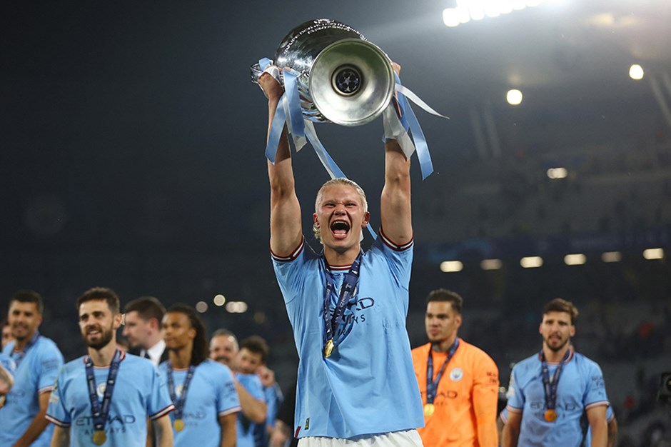 Manchester City’nin Şampiyonlar Ligi finali yolculuğundaki 13 maçında da forma giyen ve attığı 12 golle krallık yarışını zirvede tamamlayan 22 yaşındaki yıldız futbolcu, kariyerinin ilk Şampiyonlar Ligi şampiyonluğunu yaşadı.Haaland, turnuvada sezon boyunca kırdığı rekorlarla adından sıkça söz ettirdi.Son 16 turunda, ilk yarısında “hat-trick” yaptığı Leipzig maçında toplam 5 kez rakip fileleri havalandıran Haaland, turnuvada 30 gole en hızlı ve en genç yaşta ulaşan futbolcu oldu.22 yaş 236. gününde 30 gole ulaşan Norveçli yıldız, Kylian Mbappe’nin 22 yaş 352 günle kırdığı rekoru geride bıraktı.”Devler Ligi”ndeki 25. maçında 30 gole ulaşarak erişilmesi güç bir istatistiğe daha imza atan Haaland, 34 karşılaşmayla bu alanda rekoru elinde tutan eski Hollandalı futbolcu Ruud Van Nistelrooy’u zirveden indirdi.Haaland ayrıca, turnuvada bir maçta 5 gol atan 3. futbolcu oldu. Organizasyonda daha önce Ekim 2014’te Shakhtar Donetsk formasıyla Brezilyalı Luiz Adriano, Mart 2012’de de Barcelona formasıyla Lionel Messi takımları adına 5 gol kaydetmişti.Böylece Haaland, Manchester City’deki ilk sezonunda 3 şampiyonluk sevinci yaşadı.